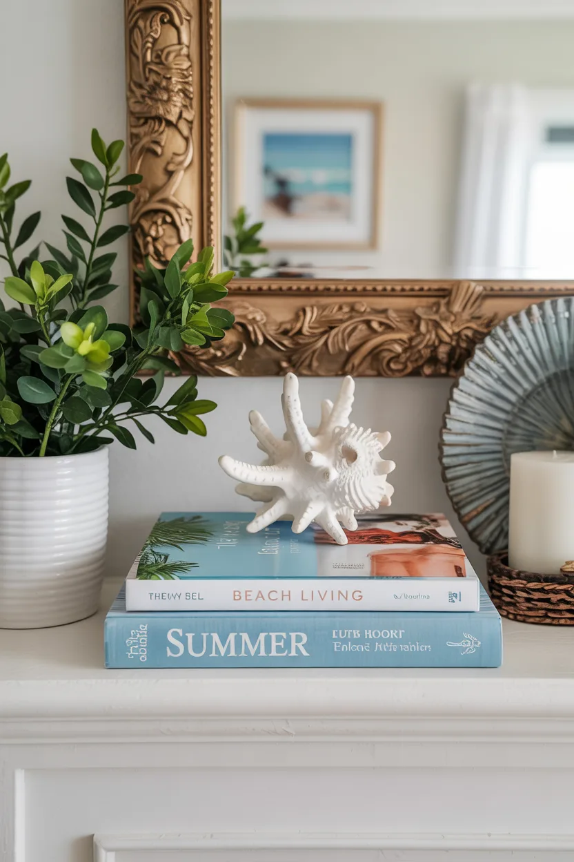 Books with white, sky blue, or sandy beige covers fit perfectly into a summer theme. Choose ones with subjects like beach living, summer recipes, travel, or outdoor entertaining. Stack them horizontally and top with a small decor item like a seashell, coral piece, or candle. It adds personality while doubling as inspiration.